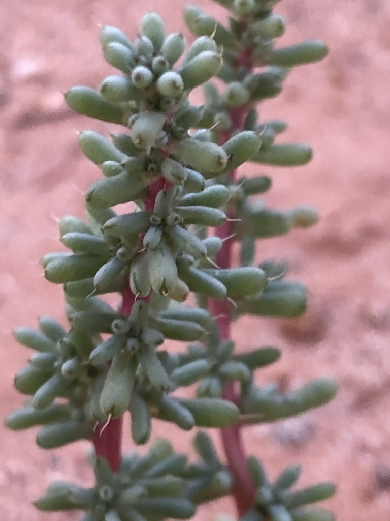 Halogeton is a succulent annual forb, usually 6-20 inches tall. It has short, sausage-like leaves about half an inch long and bluish-green. Its stem is red when mature, and its flowers are densely clustered, greenish-yellow to red. Before flowering, it can look similar to an immature russian thistle. Still, it can be differentiated by its cottony hairs on leaf axils and a singular bristle at the end of each leaf tip. [3,4,8,9]
